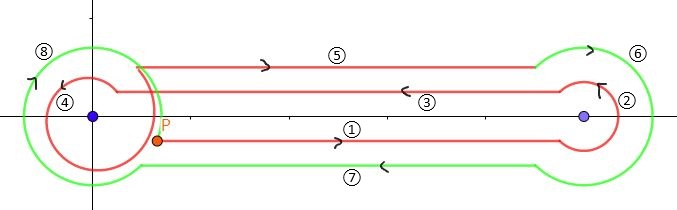 あとは①③⑤⑦を考えればいいですね。\begin{eqnarray*}&&\oint_Pt^{\a-1}(1-t)^{\b-1}dt\\&=&\int_0^1t^{\a-1}(1-t)^{\b-1}dt+\int_1^0t^{\a-1}\left((1-t)e^{2\pi i}\right)^{\b-1}dt\\&&+\int_0^1\left(te^{2\pi i}\right)^{\a-1}\left((1-t)e^{2\pi i}\right)^{\b-1}dt+\int_1^0\left(te^{2\pi i}\right)^{\a-1}(1-t)^{\b-1}dt\\&=&\int_0^1t^{\a-1}(1-t)^{\b-1}dt-\int_0^1t^{\a-1}(1-t)^{\b-1}e^{2\pi i\b}dt\\&&+\int_0^1t^{\a-1}e^{2\pi i\a}(1-t)^{\b-1}e^{2\pi i\b}dt-\int_0^1t^{\a-1}e^{2\pi i\a}(1-t)^{\b-1}dt\\&=&(e^{2\pi i\a}-1)(e^{2\pi i\b}-1)\int_0^1t^{\a-1}(1-t)^{\b-1}dt\\&=&e^{\pi i(\a+\b)}(e^{\pi i\a}-e^{-\pi i\a})(e^{\pi i\b}-e^{-\pi i\b})\int_0^1t^{\a-1}(1-t)^{\b-1}dt\\&=&-4e^{\pi i(\a+\b)}\sin\pi\a\sin\pi\b \int_0^1t^{\a-1}(1-t)^{\b-1}dt\end{eqnarray*}最後に現れたのはよく知られたベータ関数の積分表示です。