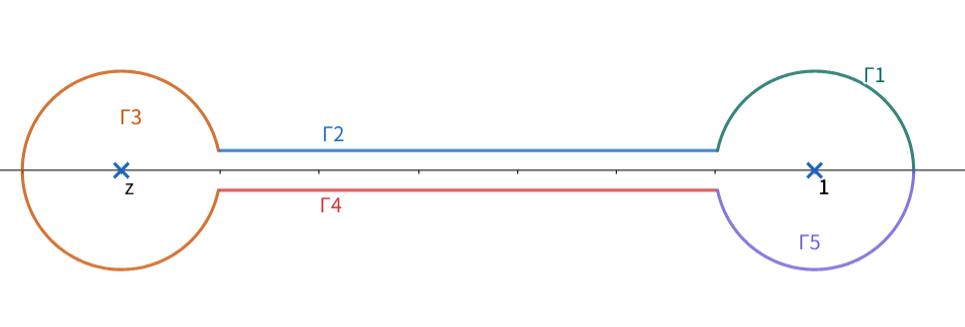 図より$$\oint_C=\int_{\G_1}+\int_{\G_2}+\int_{\G_3}+\int_{\G_4}+\int_{\G_5}$$$f(t)$ に関する偏角を$$0<\arg(t-1)<2\pi\;,\; 0<\arg(t-x)<2\pi$$に限定します。また経路は十分小さい円と実軸に十分小さい直線から成るため、常に $\arg(t+1)=0$ としてよいです。積分路のスタートは $t=1+\epsilon$ で $\arg(t-1)=0$ , $\arg(t-x)=0$ とします。ゴールはもちろん同一地点ですが偏角が $\arg(t-1)=2\pi$ , $\arg(t-x)=2\pi$ となります。